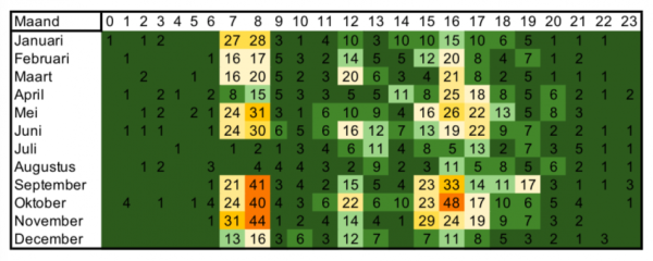 Aantal gewonde en omgekomen fietsers en voetgangers van 10 tot en met 18 jaar in 2018 volgens maand van het jaar en uur van de dag (Bron: FOD Economie AD Statistiek, Infografie: aVHV)