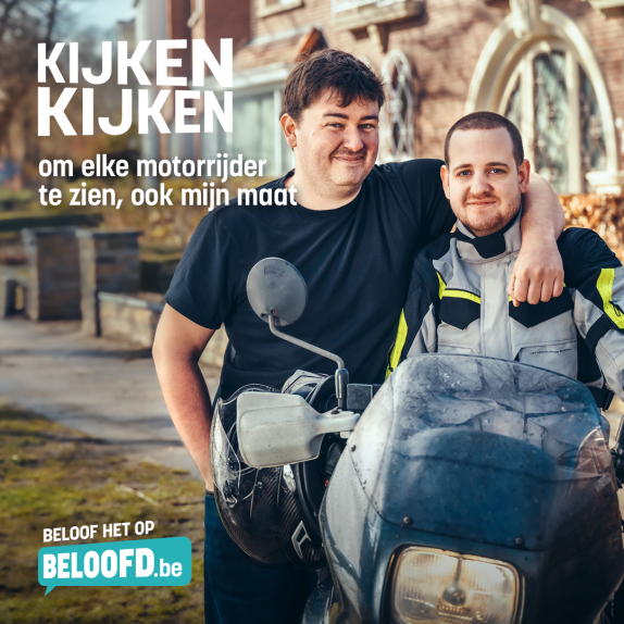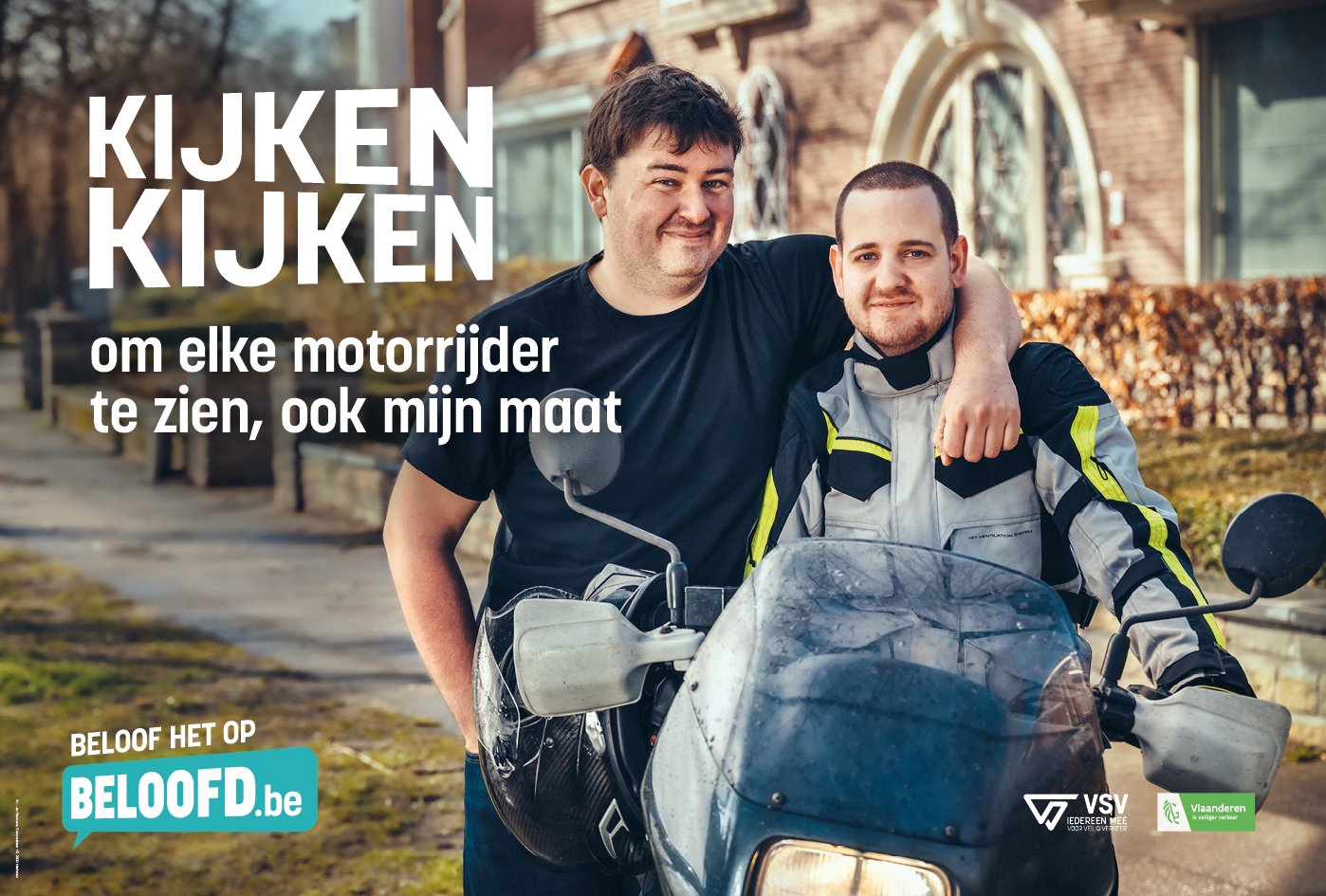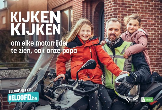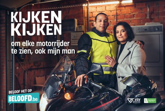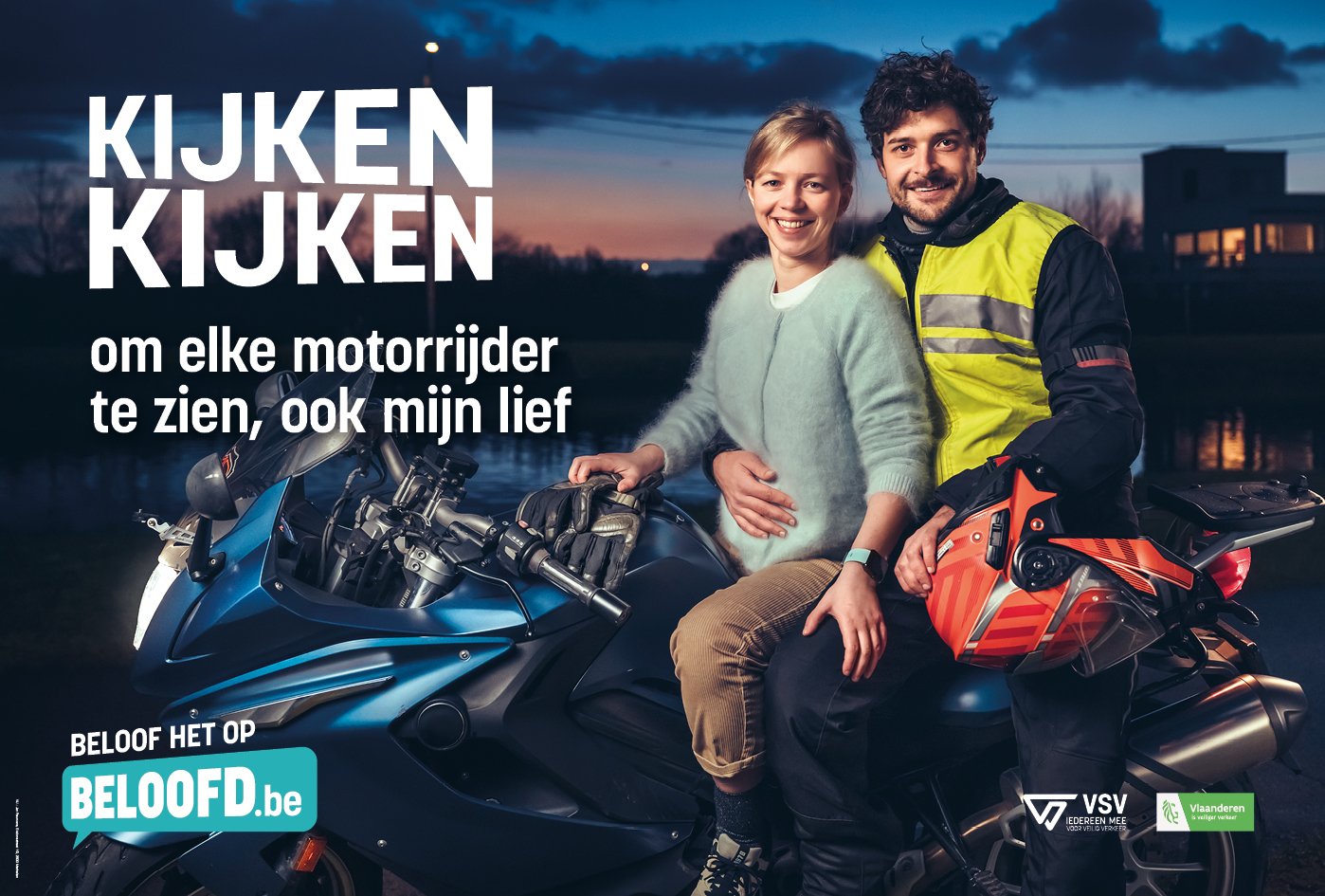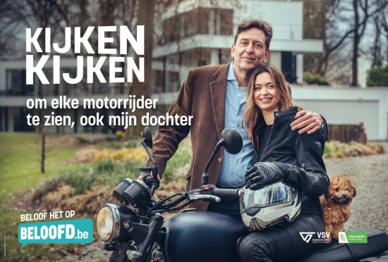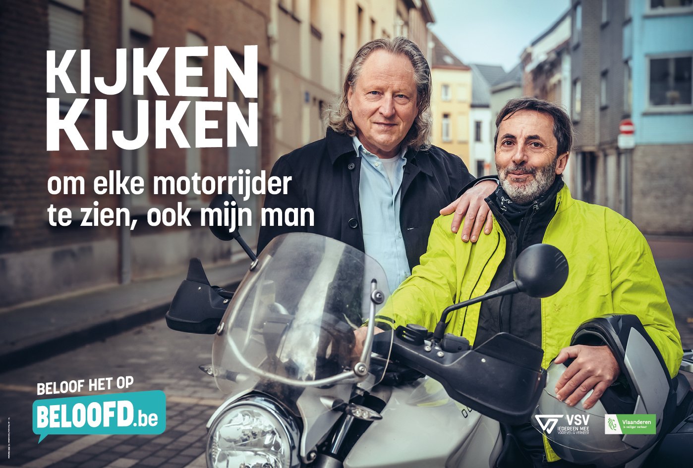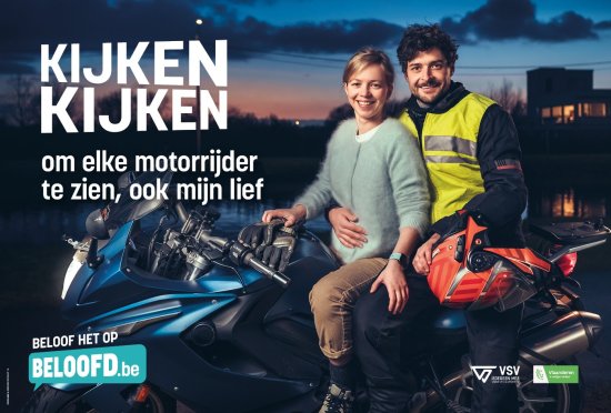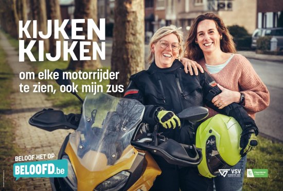 De VSV start daarom een affichecampagne langs de Vlaamse hoofdwegen. Op zeven verschillende affiches zien we telkens een motorrijder in het gezelschap van een vriend, partner of familielid die automobilisten aanspoort om te “kijken kijken om elke motorrijder te zien”. VSV-onderzoek wijst uit dat 71% van de Vlaamse autobestuurders bezorgd is over zijn of haar partner wanneer die met de motor rijdt, 47% is bezorgd over familieleden die met de motor rijden (2). Dat elke motorrijder wel iemands vriend, partner of familielid is, is de beste reden om dubbel uit te kijken en ongevallen te vermijden.