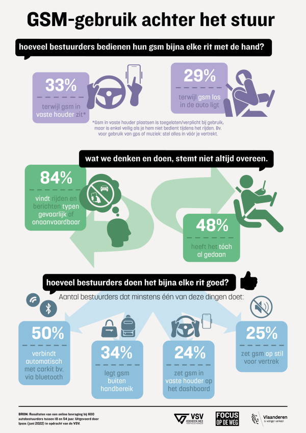 (1) Online panelbevraging bij 600 autobestuurders (18-54 jaar) in Vlaanderen die in het bezit zijn van een smartphone, uitgevoerd door Ipsos in juni 2022 in opdracht van de VSV.