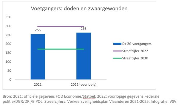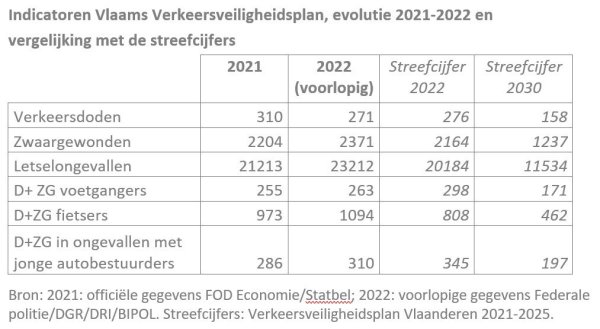 Volgens de voorlopige ongevallencijfers van de Federale Politie telde Vlaanderen vorig jaar 271 verkeersdoden, een daling ten opzichte van 2021 en het laagste aantal op het coronajaar 2020 na. Vijf andere indicatoren die zijn vastgelegd in het Verkeersveiligheidsplan Vlaanderen evolueren echter minder gunstig: zowel de cijfers voor zwaargewonden, letselongevallen, dode en zwaargewonde voetgangers, dode en zwaargewonde fietsers, en doden en zwaargewonden bij ongevallen met jonge autobestuurders vertonen een stijging ten opzichte van het jaar voordien. (1)