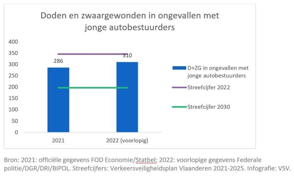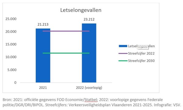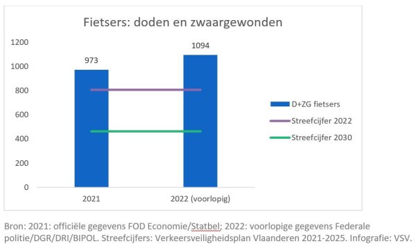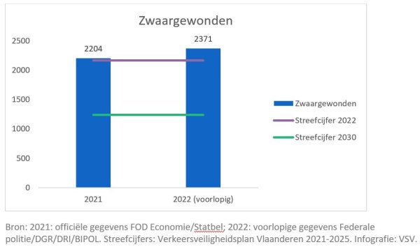 Drie van de zes streefcijfers voor 2022 worden daarbij overschreden. Dat is het geval voor het totale aantal zwaargewonden (2.371 volgens de voorlopige cijfers, het streefcijfer in het Verkeersveiligheidsplan is 2.164), het totale aantal letselongevallen (23.212 versus 20.184), en het aantal doden en zwaargewonden bij fietsers (1.094 versus 808). Voor twee andere indicatoren zitten we nog wel op schema en blijven we onder het streefcijfer, al stellen we ook daar een stijging vast: het gaat om het aantal dode en zwaargewonde voetgangers (263), en het aantal doden en zwaargewonden in ongevallen met jonge autobestuurders (310, zie tabel). (2)