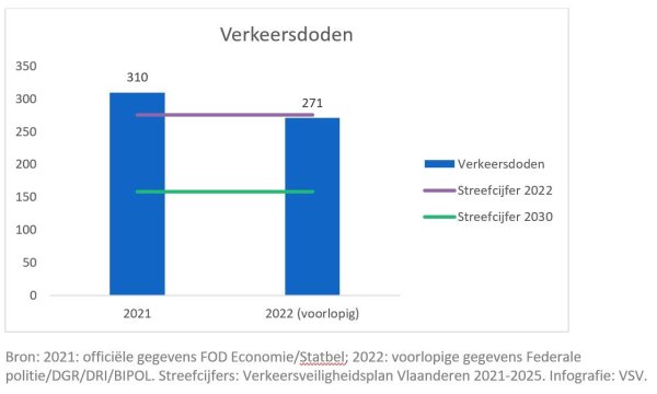 (1) Departement MOW, Semestriële voortgangsrapportering Verkeersveiligheidsplan Vlaanderen 2021-2025, februari 2023. Gegevens 2021: FOD Economie/Statbel, gegevens 2022: Federale politie/DGR/DRI/BIPOL.